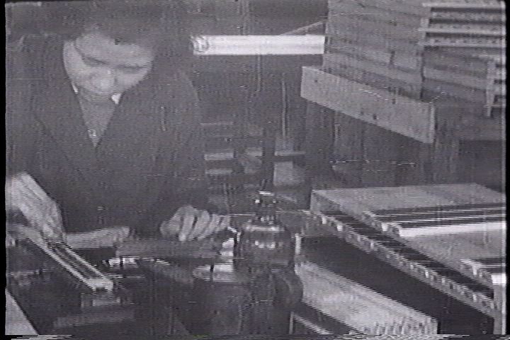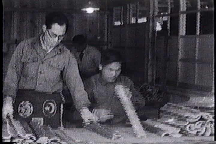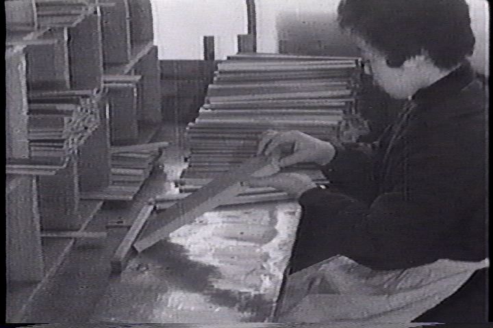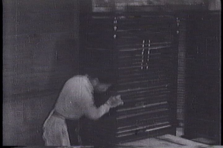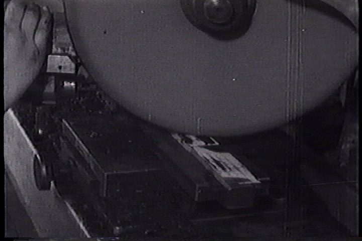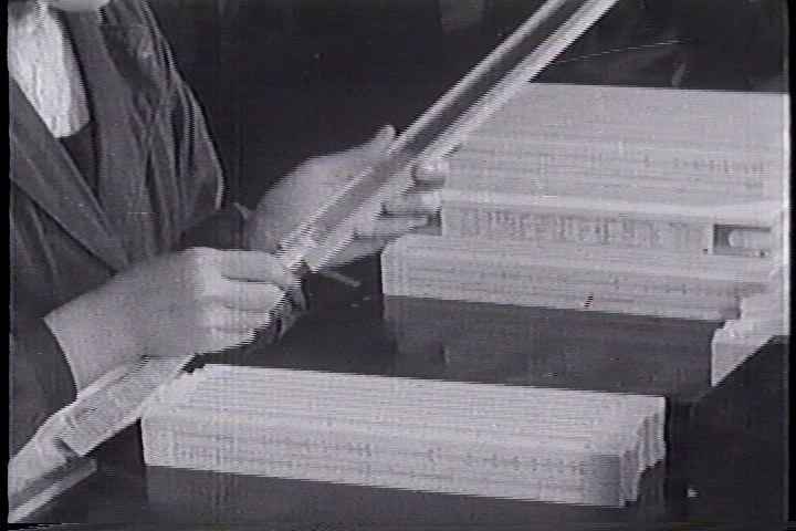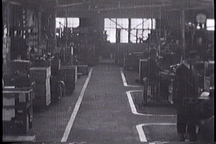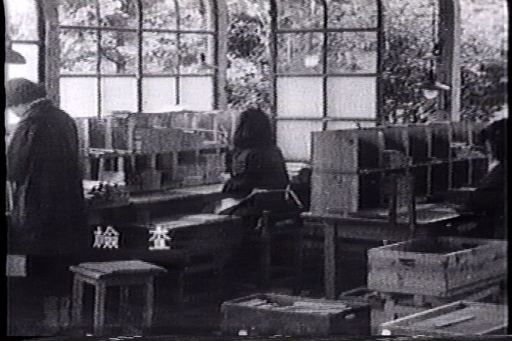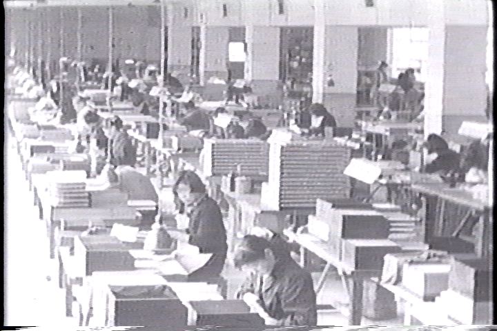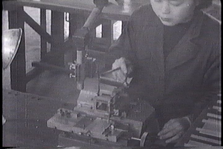 The following stills were generated from an 8mm film apparently taken by a Hemmi employee, showing various steps in the slide rule manufacturing process. They were taken from a VHS tape of the movie I received from Hemmi in the early 1990s, and, judging from some of the vehicles not seen in these stills, the original was probably created in the late 1950s.